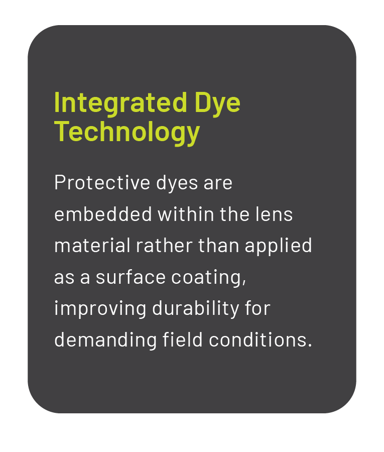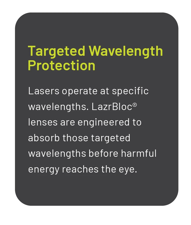LazrBloc® is Revision’s laser protective lens technology designed to block specific visible and near-infrared wavelengths while preserving mission-critical vision. Rather than relying on fragile surface coatings, LazrBloc protection is built directly into the lens material.