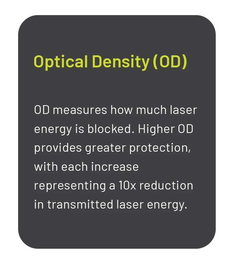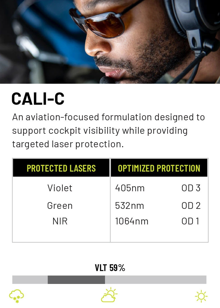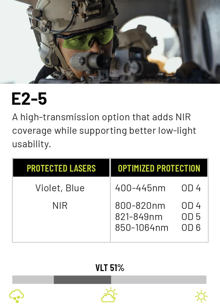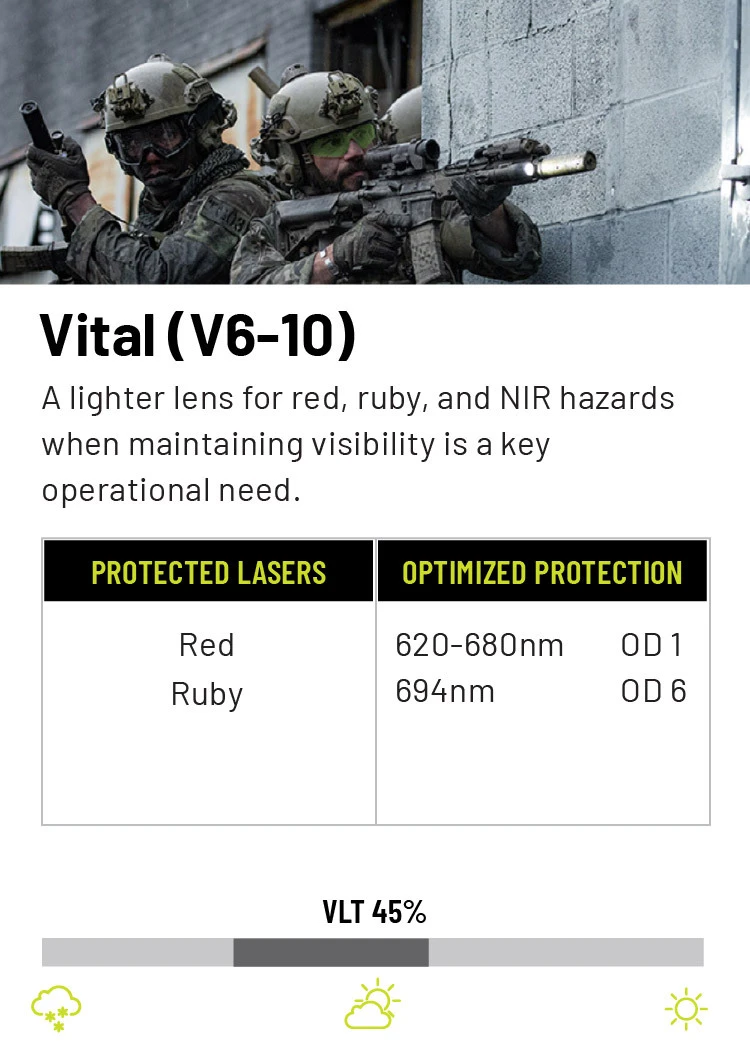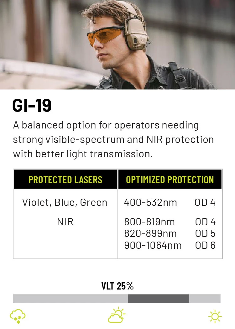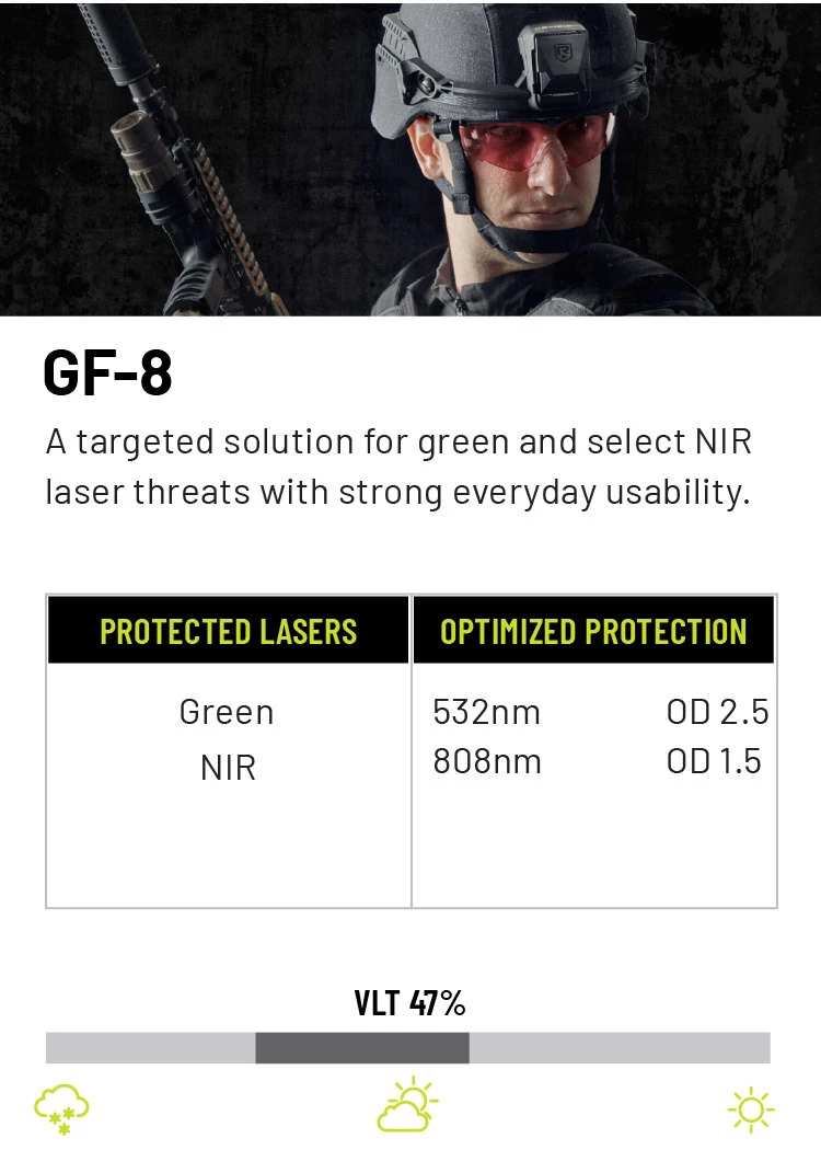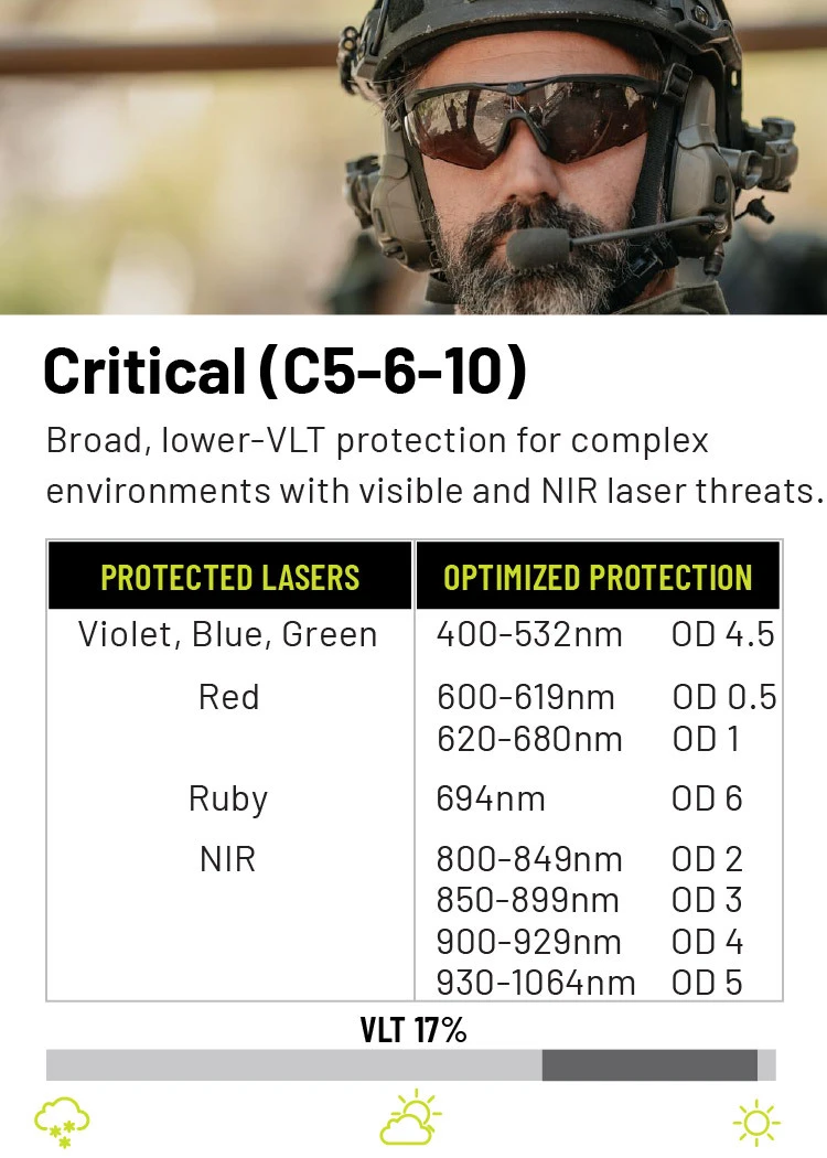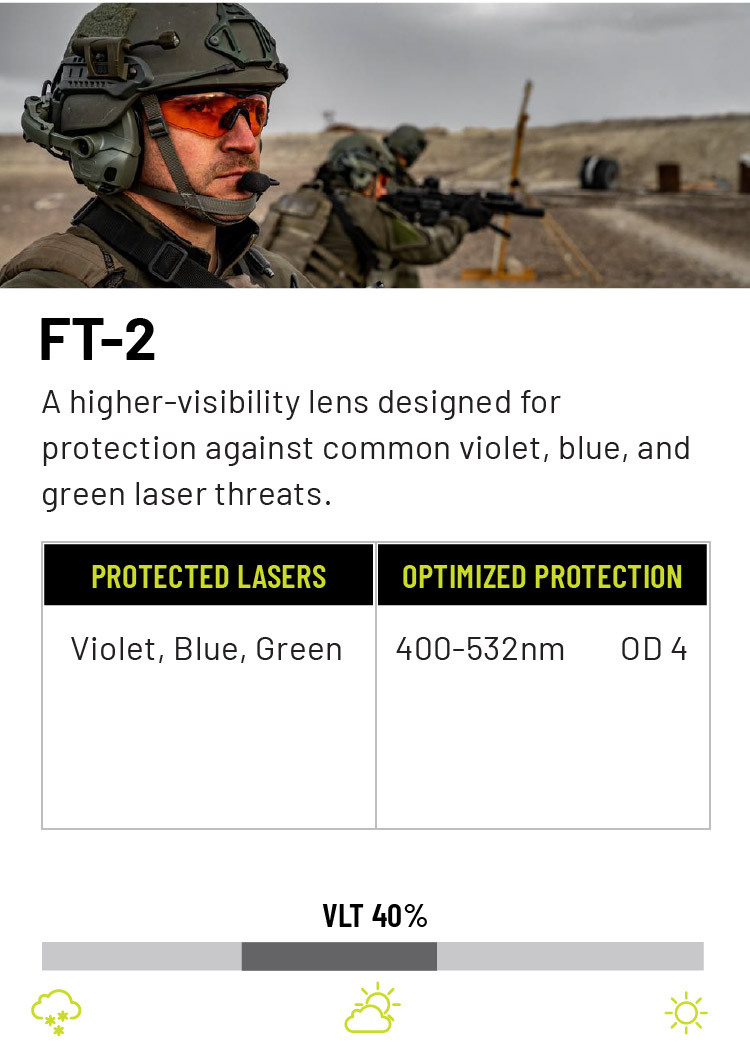 The best option for laser protection will vary depending upon the users’ specific needs. When choosing a laser protective lens, match the lens to the specific laser wavelengths you’re most likely to face, balancing optical density (OD) for protection with visible light transmission (VLT) for situational awareness. Since no single lens can block all colors, select a solution that targets the most common threats in your environment—such as green or near-infrared—while still allowing enough clarity for mission effectiveness. Whether it be visible green, blue or violet lasers or non-visible IR lasers, we have seven different laser protection options suited for your needs and protection.