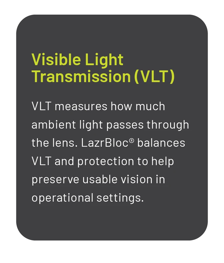 Laser protection always requires tradeoffs. LazrBloc® is engineered to balance optical density, visible light transmission, durability, and ballistic performance so operators can stay protected without sacrificing the visibility needed to act.
